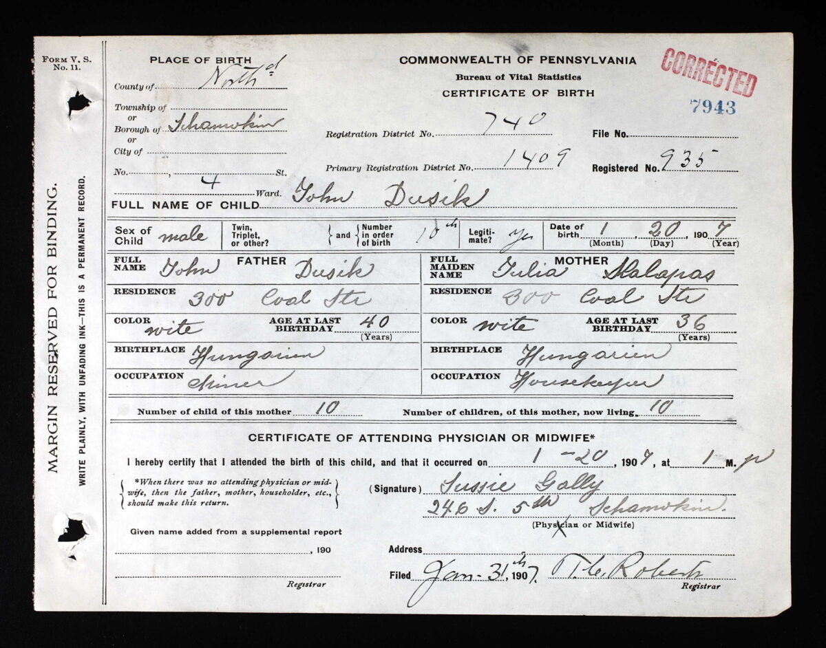 The mid-wife was Susie Gally. She lived right across the bridge and creek street from 300 S. Coal Street on 5th Street.