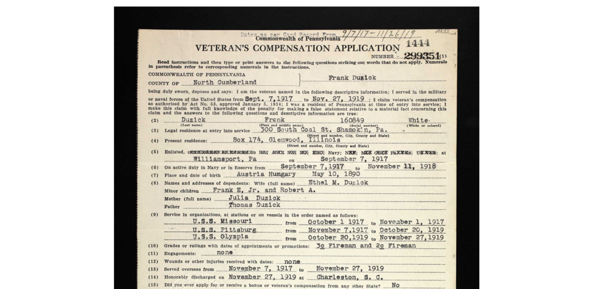 Comments by Gary Dusick: The above writing is kind of accurate. Old census records in a few places state that Frank is a nephew to Thomas Dudzik Duzick. The Thomas Jr., Joseph, Stephen, and Mary would have been Frank’s cousins. Thomas Dudzik who was Thomas Dudzik Duzicks father was married to Maria Kiss. They had three other sons, Joannes, Paulus, and Ignack. Frank could have been the son of either one. Or the son of Julia and her first husband Paul Seich. Julia and Paul were married in 1889. Frank was born in 1890. Plus, Thomas and his first wife Mary had Anna on 21 Jan. 1890 and Frank was born 10 May 1890. Can’t have two kids 4 months apart.
