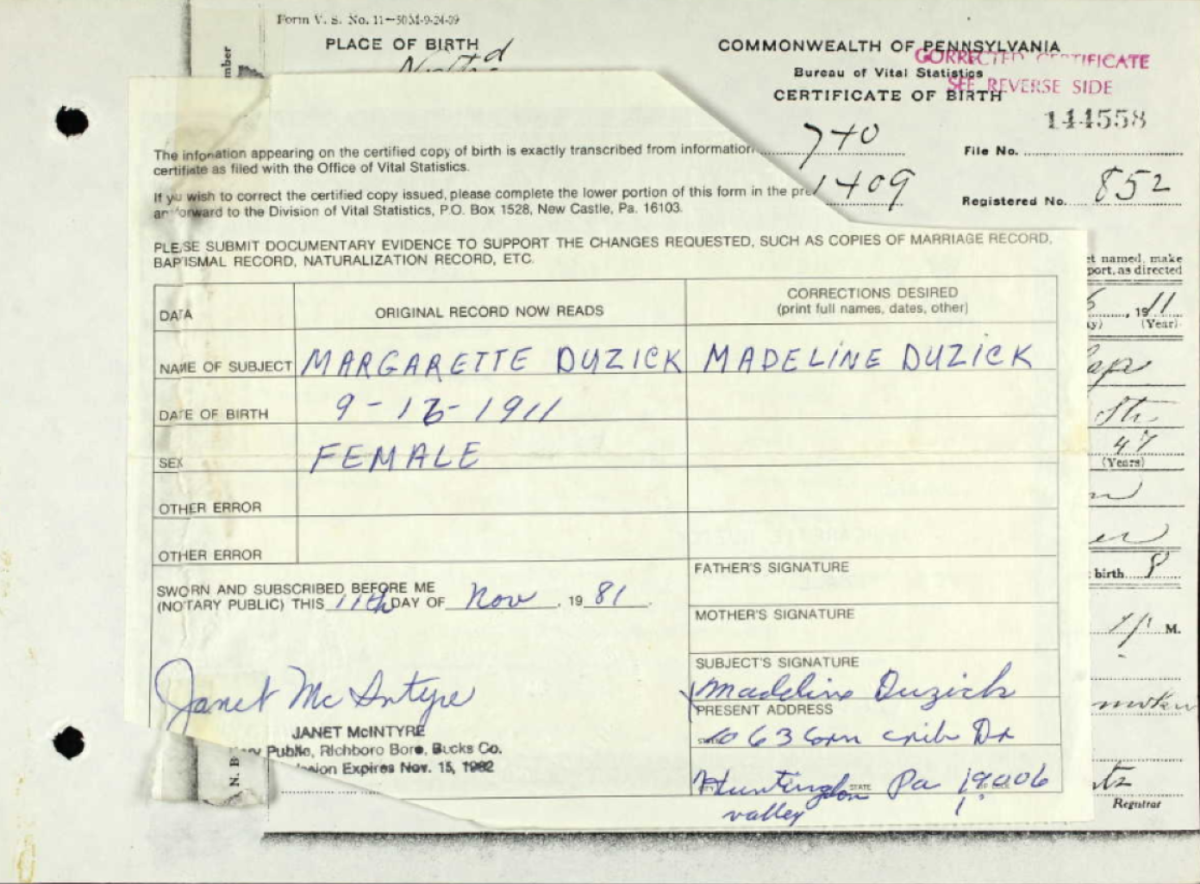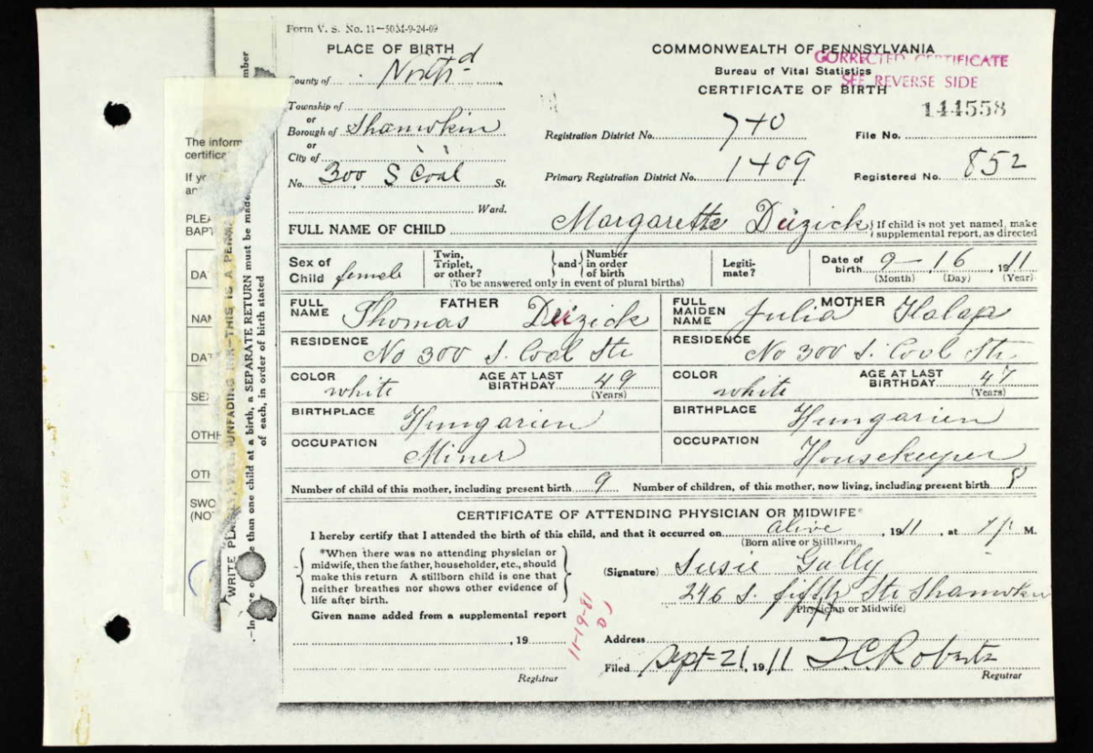 Madeline was born as Margarette. Mid-wife Susie Gally. See next block for name change,