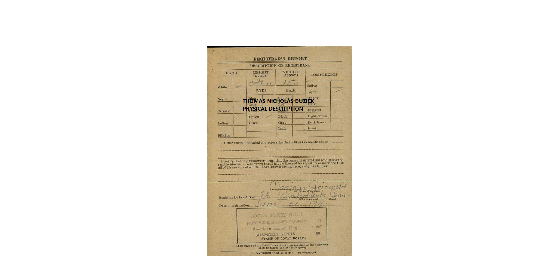Show Bio Birth name Thomas Nicholas Duzick Place of Birth Shamokin Pennsylvania Place of Death Shamokin Pennsylvania Father Go to profile page Thomas John Duzick (1899 - 1976) Go to profile page Thomas Nicholas Duzick (1923 - 1978) Spouse Go to profile page Helen Krist Duzick (1929 - 2014) Daughter Go to profile page Karen Duzick Kepner